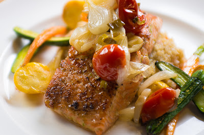 | seared salmon, tomato and spring onion confit/local farm vegetables/quinoa pilaf |